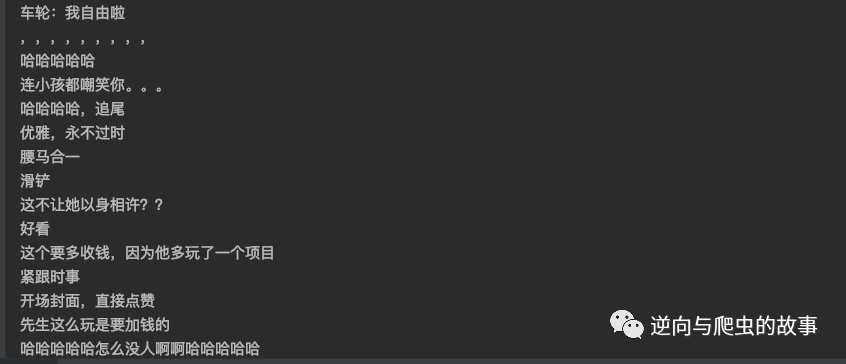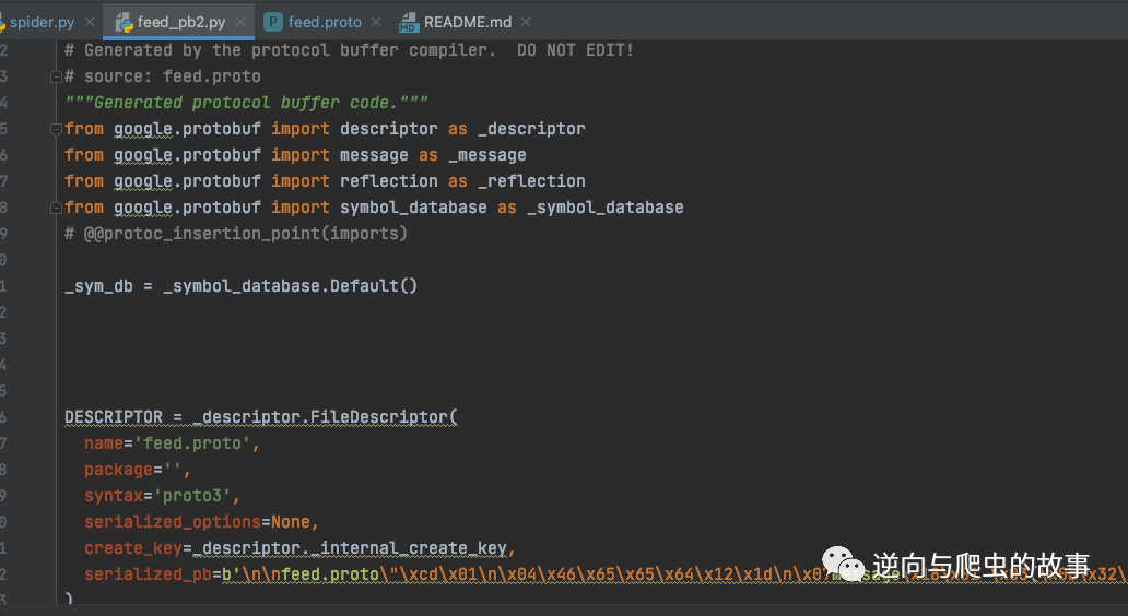 # -*- coding: utf-8 -*-# --------------------------------------# @author : 公众号:逆向与爬虫的故事# --------------------------------------import requestsfrom feed_pb2 import Feedfrom google.protobuf.json_format import MessageToDictdef start_requests():cookies = {'rpdid': '|(J~RkYYY|k|0J\'uYulYRlJl)','buvid3': '794669E2-CEBC-4737-AB8F-73CB9D9C0088184988infoc','buvid4': '046D34538-767A-526A-8625-7D1F04E0183673538-022021413-+yHNrXw7i70NUnsrLeJd2Q%3D%3D','DedeUserID': '481849275','DedeUserID__ckMd5': '04771b27fae39420','sid': 'ij1go1j8','i-wanna-go-back': '-1','b_ut': '5','CURRENT_BLACKGAP': '0','buvid_fp_plain': 'undefined','blackside_state': '0','nostalgia_conf': '-1','PVID': '2','b_lsid': '55BA153F_18190A78A34','bsource': 'search_baidu','innersign': '1','CURRENT_FNVAL': '4048','b_timer': '%7B%22ffp%22%3A%7B%22333.1007.fp.risk_794669E2%22%3A%2218190A78B5F%22%2C%22333.788.fp.risk_794669E2%22%3A%2218190A797FF%22%2C%22333.42.fp.risk_794669E2%22%3A%2218190A7A6C5%22%7D%7D',}headers = {'authority': 'xxxxxx','accept': '*/*','accept-language': 'zh-CN,zh;q=0.9','cache-control': 'no-cache','origin': 'https://www.xxxxx.com','pragma': 'no-cache','referer': 'https://www.xxxxxx.li.com/video/BV1434y1L7rb?spm_id_from=333.851.b_7265636f6d6d656e64.1&vd_source=8d45ec9ed78652f966b3625afe95e904','sec-ch-ua': '".Not/A)Brand";v="99", "Google Chrome";v="103", "Chromium";v="103"','sec-ch-ua-mobile': '?0','sec-ch-ua-platform': '"macOS"','sec-fetch-dest': 'empty','sec-fetch-mode': 'cors','sec-fetch-site': 'same-site','user-agent': 'Mozilla/5.0 (Macintosh; Intel Mac OS X 10_15_7) AppleWebKit/537.36 (KHTML, like Gecko) Chrome/103.0.0.0 Safari/537.36',}params = {'type': '1','oid': '729126061','pid': '896926231','segment_index': '1',}response = requests.get('https://xxxx.xxxx.com/x/v2/dm/web/seg.so', params=params, cookies=cookies,headers=headers)info = Feed()info.ParseFromString(response.content)_data = MessageToDict(info, preserving_proto_field_name=True)messages = _data.get("message") or []for message in messages:print(message.get("content"))if __name__ == '__main__':start_requests()