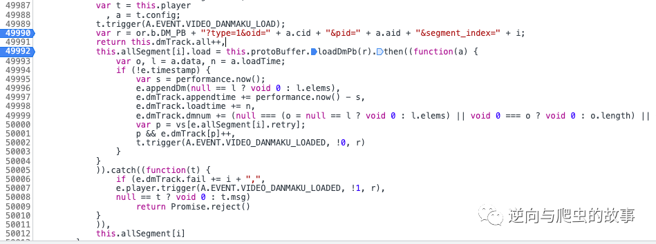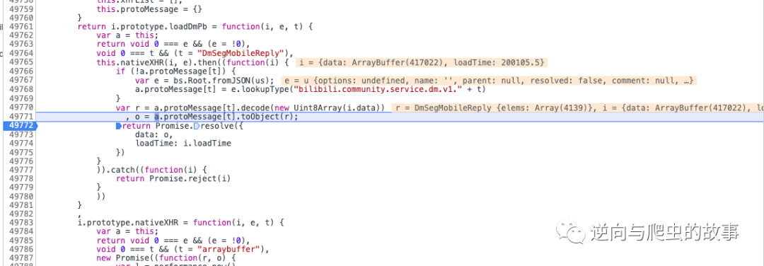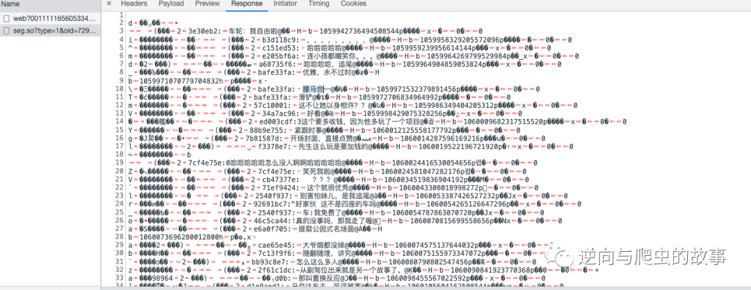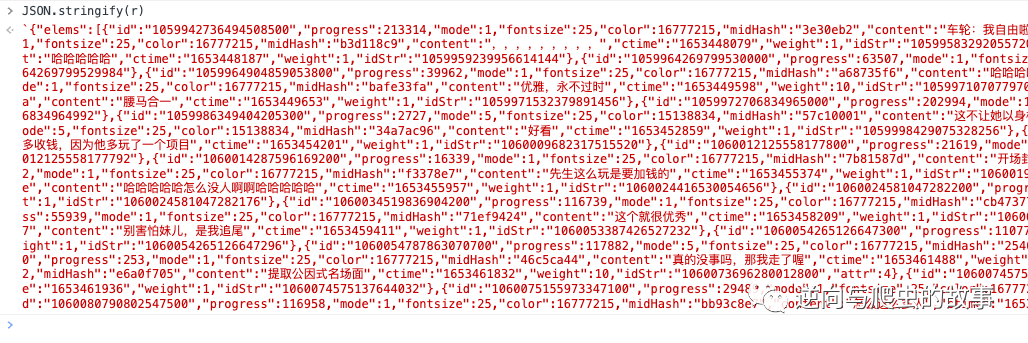 说明:从截图中我们可以清楚看出,这就是弹幕的内容。但是毕竟使用了protobuf协议编码,我们如果想还原出明文信息,接下来需要去进行JS断点调试分析了。